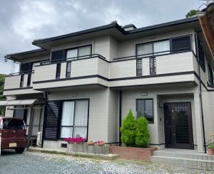 使用材料 | 屋根 屋根用弱溶剤2液型フッ素樹脂塗料 外壁 高耐久砂壁改修塗材 その他付帯物 弱溶剤2液型フッ素樹脂塗料 |