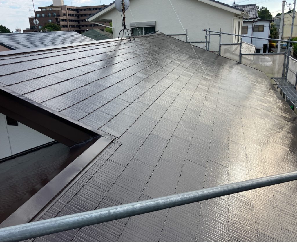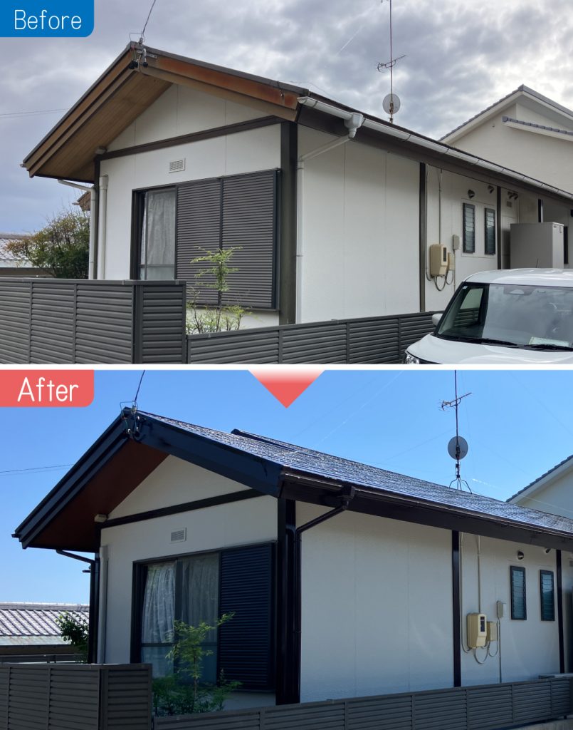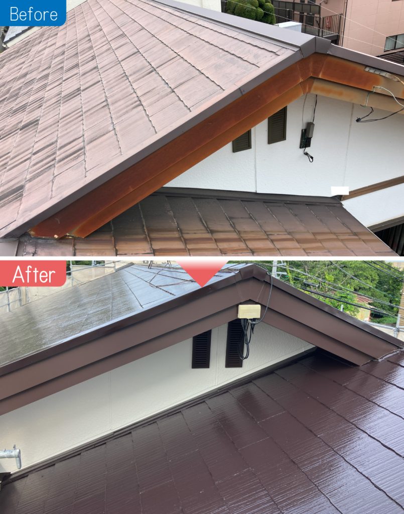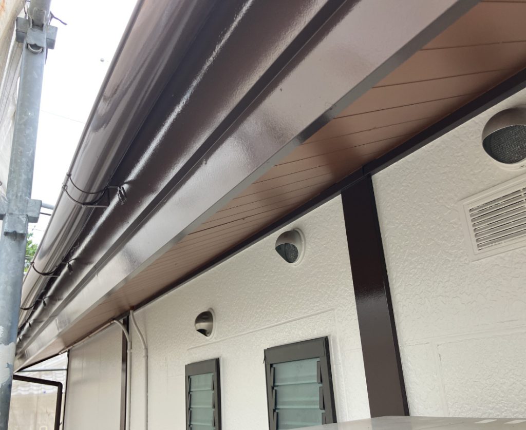 外壁は既存色としましたが、屋根や樋、細物の鉄部にはダークブラウンを採用し、メリハリのある仕上がりとなりました!